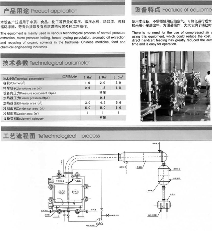 本設(shè)備廣泛適用于中藥、食品、化工等行業(yè)的常壓,微壓水煎,熱回流,強(qiáng)制循環(huán)滲流,芳香油提取及有機(jī)溶煤回收等多種工藝操作。