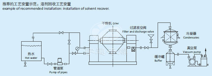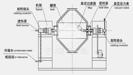SZG系列雙錐回轉真空干燥機為雙錐形的回轉罐體,罐體在真空狀態下,向夾套內通入導熱油或熱水進行加熱,熱量通過罐體內壁與濕物料接觸。濕物料吸熱后蒸發的水汽或其他氣體,通過真空泵經真空排氣管被抽走。由于罐體內處于真空狀態,且罐體的回轉使物料不斷的上下,內外翻動,故加快了物料的干燥速度,提高干燥速率,達到均勻干燥的目的。
