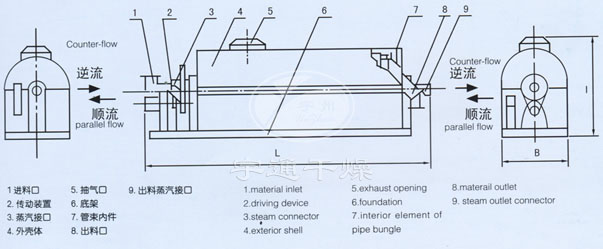 GZG管束式干燥機是間接加熱接觸式干燥機,既可順流干燥也可逆流干燥。是目前大部分國家使用的廣泛、的干燥機之一。其主要優點是經濟實用。在各種干燥設備中,動力消耗低,熱耗低,每蒸發1公斤水僅需要量1.5-2公斤蒸氣。是沸騰式干燥機的50%。烘干1噸發酵草粉耗電僅需要15千瓦/時,是流化床的25%,電耗氣耗均達到國外同類產品的水平。可干燥高水份物料,干燥彈性大(能視不同的物料性質和水份要求對干燥時間進行調整);連續生產(自動化程度高)也可間歇生產(適合于特殊生產工藝)。該機附加配套設備少,占地面積小。工藝緊湊,受磨損件極少,易于安裝。