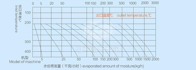 注:水份蒸發(fā)量與物料的特性及熱進(jìn)風(fēng)、出口溫度相關(guān)。當(dāng)出口溫度為90oC,其水份蒸發(fā)曲線見(jiàn)上圖(供選型參考),隨著產(chǎn)品不斷更新,有關(guān)參數(shù)變更,恕不預(yù)先通知。