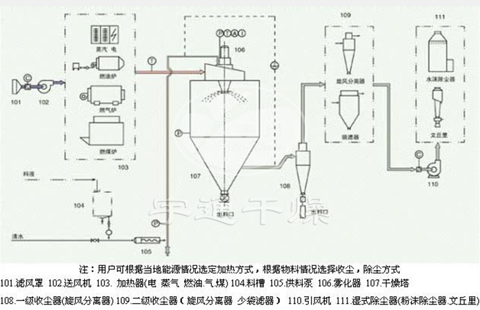 噴霧干燥機(jī)為開(kāi)式循環(huán),并流式,離心式霧化。干燥介質(zhì)空氣經(jīng)過(guò)初、中效空氣過(guò)濾器過(guò)濾后根據(jù)操作指令由鼓風(fēng)機(jī)吸取再經(jīng)加熱器加熱通過(guò)過(guò)濾器的熱風(fēng)分配器進(jìn)入噴霧干燥主塔。液體物料根據(jù)操作指令經(jīng)過(guò)蠕動(dòng)泵,進(jìn)入高速旋轉(zhuǎn)的離心噴頭,在離心力作用下被分散成小霧滴。在噴霧干燥主塔內(nèi),小霧滴與熱風(fēng)在充分接觸,沿其特定路徑進(jìn)行熱交換后被干燥成為產(chǎn)品,然后通過(guò)旋風(fēng)分離器實(shí)現(xiàn)分離,固體物料被收集,氣體介質(zhì)再經(jīng)過(guò)過(guò)濾后被排出。整套噴霧系統(tǒng)易清潔、無(wú)死角,符合GMP要求。