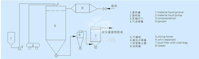 潔凈空氣加熱后進入干燥塔,在塔內熱風中用二流體(或三流體)噴嘴將各種料液物化成微小液滴,與熱風進行快速熱交換,蒸發掉液料中的水份(或溶劑),并隨熱風排出,得到粉狀產品。