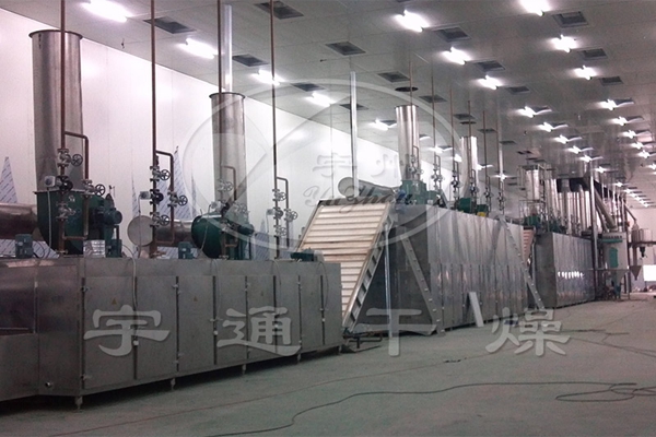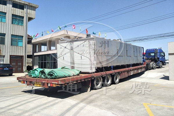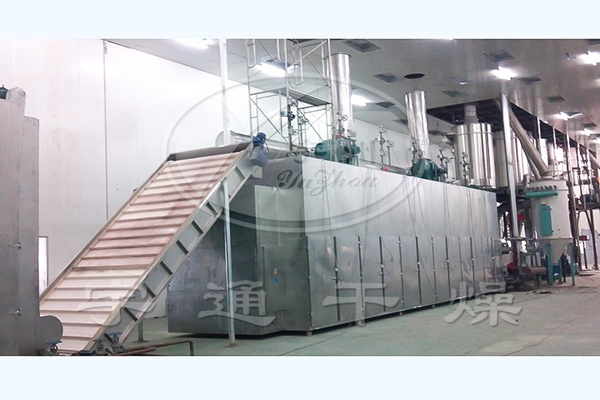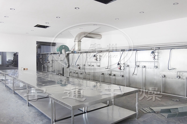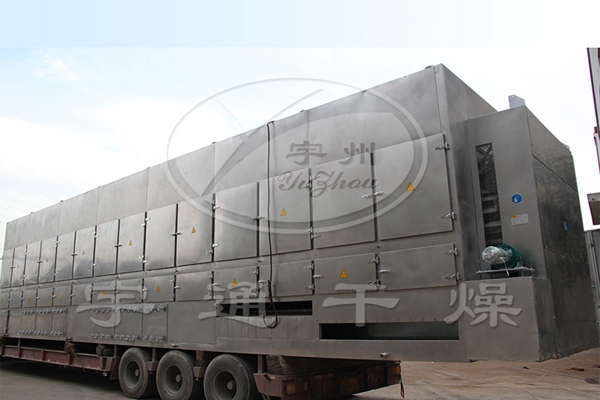 該機屬廂式結構,廂內設有多層傳送帶,傳送帶在廂內循環運動。物料均勻分布在層傳送帶上,通過鏈條的傳動,由層網帶倒入下一層網帶,下層反向交替逐一直落到后一層網帶,此時物料水份也達到烘干要求。空氣循環采用逆流工藝,高溫低濕空氣從干燥機下層網帶向上穿流,進行傳質傳熱,從而達到去除水份的目的,尾氣通過引風機由頂部排出。設備自動化程度高,物料在干燥過程自動翻料,保證物料干燥均勻。勞動強度低,工作環境好,設備維護簡單。箱底設計有落料斜板及快開清掃門,便于清理箱內粉料。