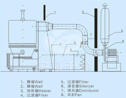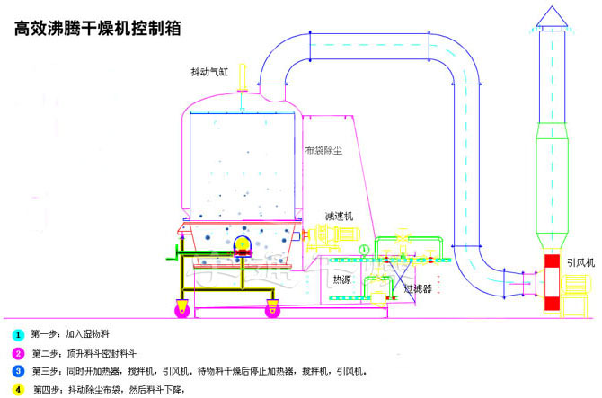 空氣在高壓離心通風(fēng)機(jī)的吸送下,經(jīng)亞空氣過濾器過濾,進(jìn)入空氣熱交換器加熱至設(shè)定溫度,然后通過氣體分布板形成無數(shù)高速氣流束沖出物料,氣束問所形成的負(fù)壓卷吸物料,使之成為沸騰狀。此狀態(tài)下熱空氣與物料廣泛地接觸,增強(qiáng)了傳熱過程,因而在較短的時(shí)間內(nèi)促使物料中的水份蒸發(fā)、分離。濕氣流透過捕集袋由風(fēng)機(jī)排出,被捕集袋截留在沸騰器內(nèi)的物料則為干燥產(chǎn)品。