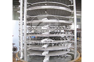 PLG系列盤式連續干燥機盤式干燥機的一層盤上,帶有耙葉的耙臂做回轉運動,使耙葉連續地翻轉物料,物料沿著指數螺旋線流過干燥盤表面,在小干燥盤上的物料移到外緣,并在外緣落到下方的大干燥盤外緣,在大干燥盤上的物料向里移動并從中間落料落入下一層小干燥盤中,大小干燥盤上下交替排列,物料得以連續地流過整個干燥機,中空的干燥盤內通入加熱介質,加熱介質從一端進入另一端導出,已干燥物料從后一層干燥盤落到殼體底層,后被耙葉移動到料口排出。蒸發出來的水蒸汽由設置在頂部的排濕口排出,夾帶的粉塵由脈沖除塵器回收,尾氣由排濕風機排出室外。底部排出的干物料可直接包裝。