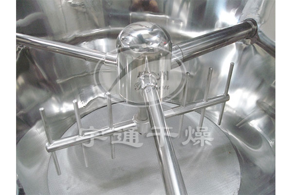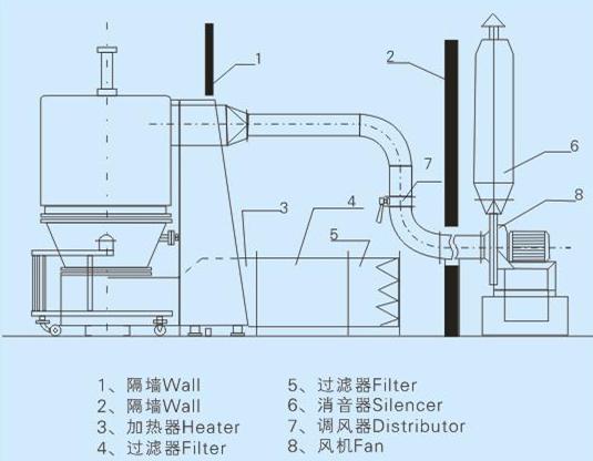 空氣經(jīng)加熱凈化后,由引風(fēng)機(jī)從下部導(dǎo)入,穿過料斗的孔網(wǎng)板。在工作室內(nèi),經(jīng)攪拌和負(fù)壓作用形成流態(tài)化,水份快速蒸發(fā)后隨著排氣帶走,物料快速干燥。