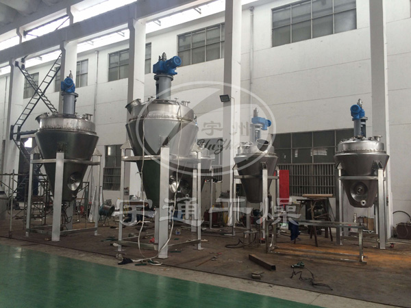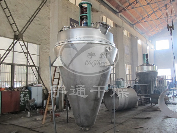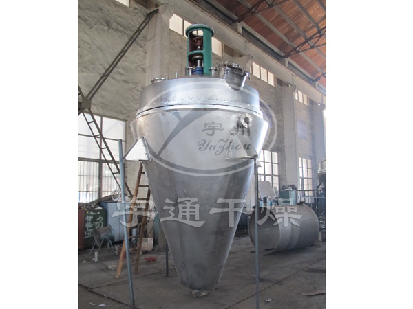 該設備主體立式靜止,內部加熱的螺帶進行圓周攪拌提升運動,物料進入干燥腔體后利用夾套和攪拌螺帶對物料接觸加熱,物料被螺帶有序的攪動,翻轉、提升、瀑落,使物料不斷的與加熱腔壁接觸而進行強制熱交換,受熱揮發的溶媒在真空狀態下被抽走,從而達到快速干燥的目的。