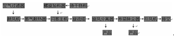 經(jīng)過初、中效過濾的環(huán)境空氣由干燥系統(tǒng)引風(fēng)機吸入熱風(fēng)空氣,與蒸汽換熱后產(chǎn)生的熱風(fēng)進入閃蒸干燥主機,與經(jīng)過螺旋加料器送入干燥主機的待干燥濾餅,在干燥主機內(nèi)完成傳熱傳質(zhì)的干燥過程,氣固混合物由旋風(fēng)分離器和布袋除塵器分離,物料被從干燥系統(tǒng)氣體內(nèi)分離出來,排出干燥系統(tǒng),尾氣由引風(fēng)機排入大氣。