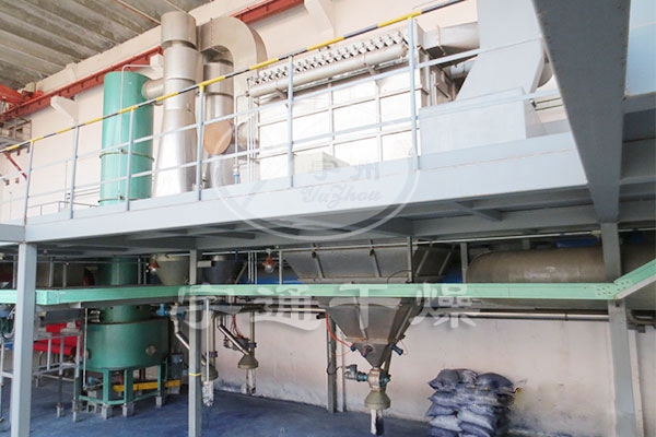 經(jīng)過(guò)初、中效過(guò)濾的環(huán)境空氣由干燥系統(tǒng)引風(fēng)機(jī)吸入熱風(fēng)空氣,與蒸汽換熱后產(chǎn)生的熱風(fēng)進(jìn)入閃蒸干燥主機(jī),與經(jīng)過(guò)螺旋加料器送入干燥主機(jī)的待干燥濾餅,在干燥主機(jī)內(nèi)完成傳熱傳質(zhì)的干燥過(guò)程,氣固混合物由旋風(fēng)分離器和布袋除塵器分離,物料被從干燥系統(tǒng)氣體內(nèi)分離出來(lái),排出干燥系統(tǒng),尾氣由引風(fēng)機(jī)排入大氣。