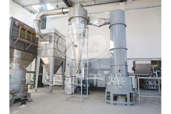 在干燥室上部,設有環狀的擋板,即分級器。物料隨旋轉氣流夾帶上升,由于受離心力作用,大塊的,未達到水份要求的(即比重較大)物料受離心力作用,其旋轉半徑增大,當其旋轉半徑大于分級器的半徑時,被擋在干燥室內進一步干燥粉碎,直至滿足要求方才溢出。較細的粉碎體在干燥室中部干燥后隨氣流夾帶上升,由于其粒徑較小且達到水份要求(即比重較小),離心力相對較小,其旋轉半徑小于分級器半徑,然后就隨氣流排出,送至收集裝置。