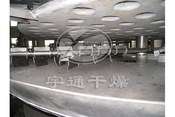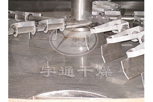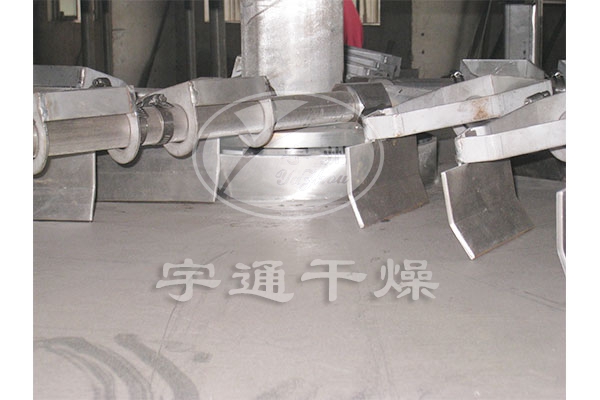 密閉型盤式連續(xù)干燥機是在常壓型盤式連續(xù)干燥機的基礎上進行密閉處理,從而更適合于需要回收溶劑、物料易氧化、物料異味較重的場合,它具有:連續(xù)運行、密閉操作、蒸發(fā)強度大、濕度梯度分布合理、動力消耗低、占地面積小、等優(yōu)點。同時,其配置簡單,不使用熱風作為加熱介質,因此,不會發(fā)生因熱風和粉塵分離不好隨尾氣夾帶造成的產品損失。盤式連續(xù)干燥機由干燥盤、耙臂、裝在耙臂上的若干耙葉、碾磙、主軸、傳動裝置、外殼等組成,中空的干燥盤內通入加熱介質。物料在干燥盤面上由耙葉輸送、翻動、呈阿基米德螺線軌跡運動,在運動過程中被干燥盤加熱,進行傳熱傳質完成干燥作業(yè),根據(jù)被干燥物料的產量、性質、初始及終含濕份量,確定干燥盤層數(shù)(干燥面積)。盤式連續(xù)干燥機立式工作,濕物料由頂部的加料口加入,通過每層干燥盤后由干燥機的底部排出,從物料中釋放出的濕氣由經除塵后由引風機排入大氣。