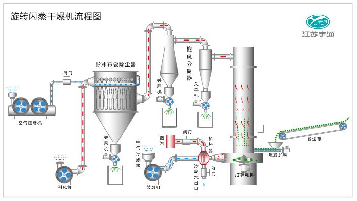 閃蒸干燥是以風做濕、熱載體,風機做動力,實現干燥過程的質、熱交換,使物料中濕份發生相變化,達到物料與濕份的分離,即干燥。主機底部設置有強有力的粉碎機構,能使螺旋器加入的濾餅狀濕物料能充分的被打散,與熱風充分接觸,增大熱接觸面積。提高蒸發強度,盡其實現瞬間干燥。所以產品的水分、細度均勻,質量好。在頂部還設有分選機構,被干燥的物料在出塔處經分選,不合格的控制在塔內繼續干燥,達到要求出塔后的物料經氣固分離器分離回收,通過卸料裝置排出。