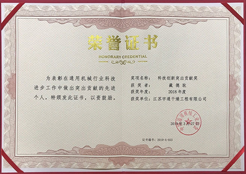 江蘇宇通干燥工程有限公司技術骨干臧德耿有幸獲得了此次獎項,并收到相關榮譽證書及獎勵。