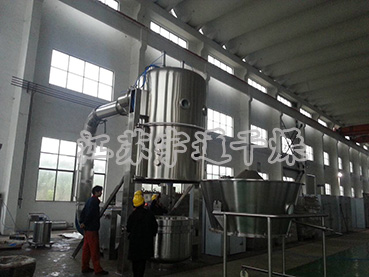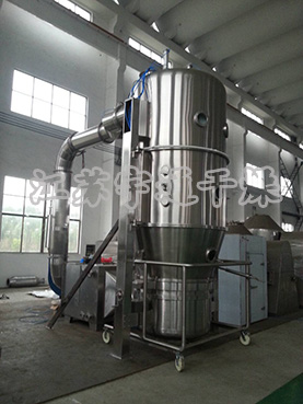 FL型沸騰制粒干燥機:物料粉末粒子,在原料容器(流化床)中呈環(huán)形流化狀態(tài)。受到經(jīng)過凈化后的加熱空氣預(yù)熱和混合,將粘合劑溶液霧化噴入,使若干粒子聚集成含有粘合劑的團粒,由于熱空氣對物料的不斷干燥,使團粒中的水分蒸發(fā),粘合劑凝固,此過程不斷重復(fù)進行,形成的、均勻的多微孔球狀顆粒。